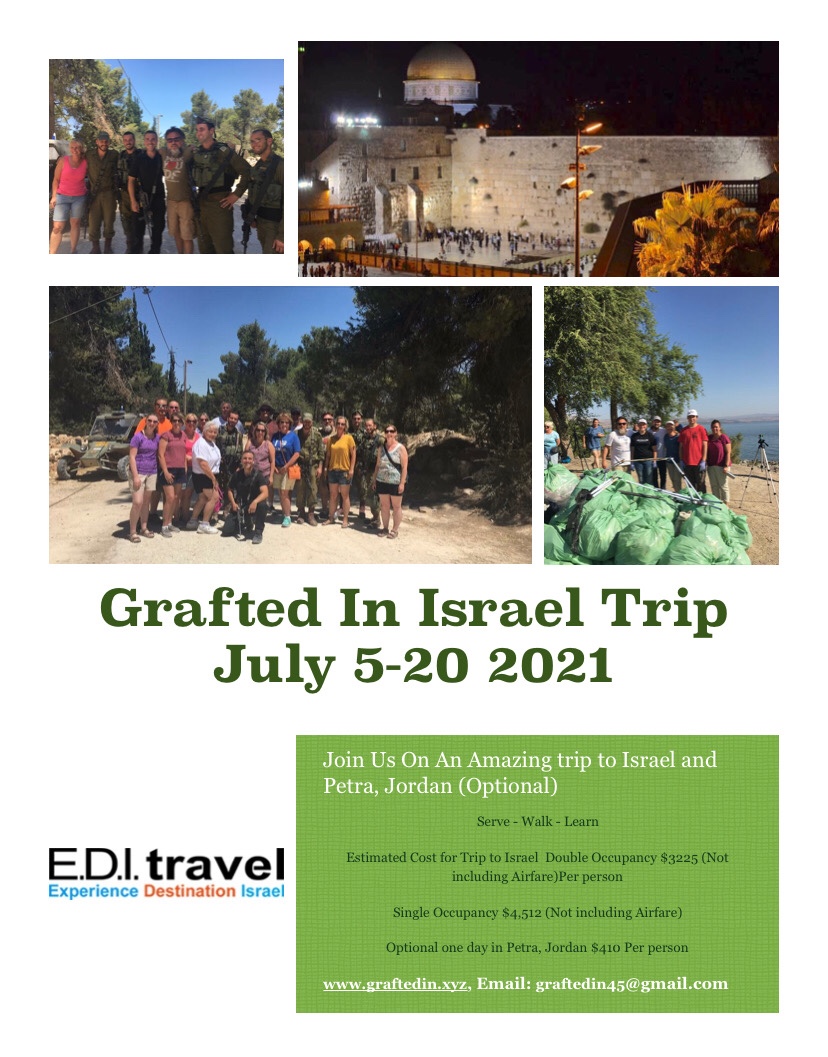 Posted on July 8, 2020 by bidcstarkIsrael July 2021 “If I forget you, Jerusalem, May my right hand wither away! May my tongue stick to the roof of my mouth if I fail to forget You, if I fail to count Jerusalem the greatest of all my joys.”Psalm 137:5-6Join us on this amazing journey!http://www.graftedin.xyz Share this: Share on X (Opens in new window) X Share on Facebook (Opens in new window) Facebook Share on X (Opens in new window) X Email a link to a friend (Opens in new window) Email Share on LinkedIn (Opens in new window) LinkedIn Share on Reddit (Opens in new window) Reddit Share on Tumblr (Opens in new window) Tumblr Share on Telegram (Opens in new window) Telegram Share on WhatsApp (Opens in new window) WhatsApp Like Loading... Related
